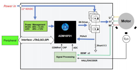 ADM16x是一款高度集成的高性能BLDC/PMSM控制器,內(nèi)部集成了6路 NMOSPre-Driver,運(yùn)算放大器,PGA,比較器,高速 ADC,SCI,SPI 等模塊。同時(shí),它采用高性能16位CPU,內(nèi)嵌 32Kx16 位 Flash, 512x16位ROM,最高工作頻率為40MHZ,可滿足高性能無刷電機(jī)控制的應(yīng)用要求,并簡(jiǎn)化系統(tǒng)成本。