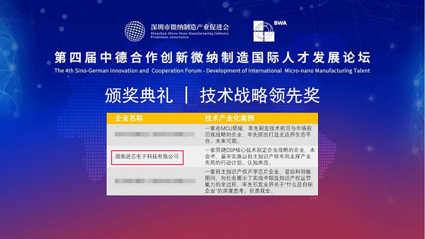 1月6日,由深圳市微納制造產(chǎn)業(yè)促進(jìn)會(huì)、德國(guó)聯(lián)邦經(jīng)濟(jì)發(fā)展和對(duì)外貿(mào)易聯(lián)合總會(huì)(BWA)聯(lián)合主辦,西麗湖人才服務(wù)中心承辦的“第四屆中德合作創(chuàng)新微納制造國(guó)際人才發(fā)展論壇”于深圳順利舉行,論壇圍繞微納制造技術(shù)產(chǎn)業(yè)化、國(guó)際合作、科創(chuàng)人才發(fā)展等話題進(jìn)行了演講和探討。在“微納制造技術(shù)產(chǎn)業(yè)化優(yōu)秀案例評(píng)選”中,進(jìn)芯電子榮獲“技術(shù)戰(zhàn)略領(lǐng)先獎(jiǎng)”。