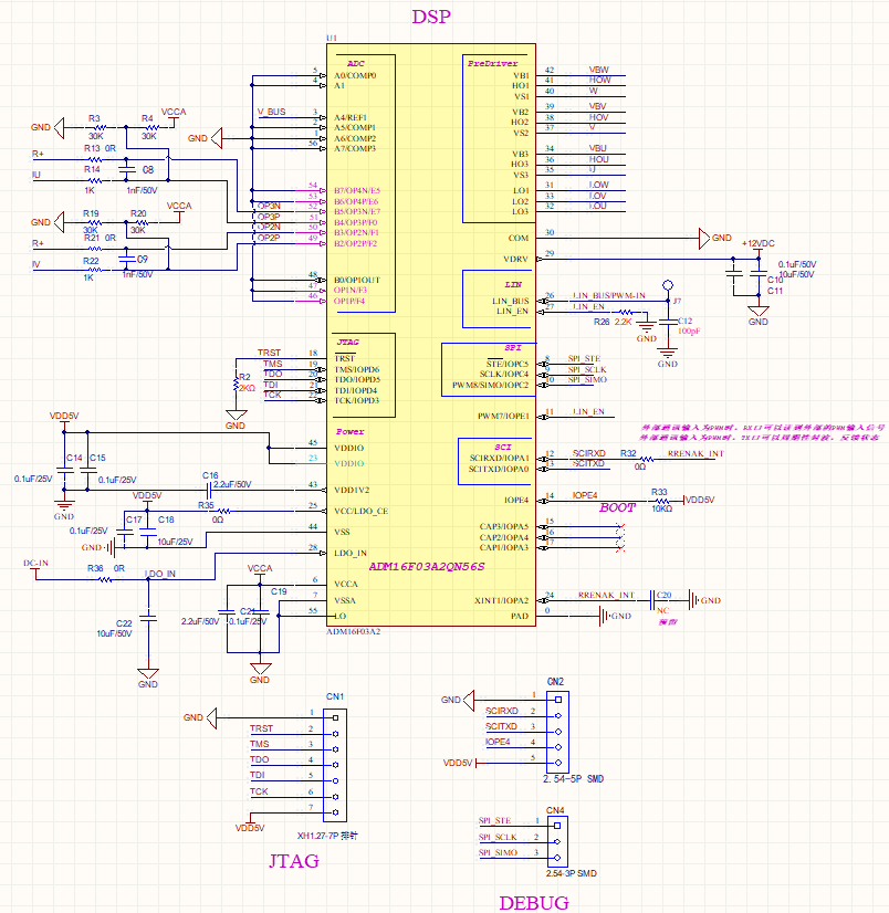 ADM16F03A2最小系統(tǒng)如下圖所示,包含JTAG接口、SPI通信接口、串口、PWM模塊、ADC模塊等。系統(tǒng)自帶的運(yùn)放PGA可以通過外圍電阻配置為差分模式用于相線電流采樣。當(dāng)需要用到SPI調(diào)試時(shí),可以通過SPI接口,借助進(jìn)芯SPI通訊調(diào)試工具進(jìn)行SPI通信調(diào)試;當(dāng)需要離線燒錄程序時(shí),通過3V3、TX、RX、GND信號測試焊盤,借助進(jìn)芯的離線燒錄工具可實(shí)現(xiàn)快速的脫機(jī)燒錄。
