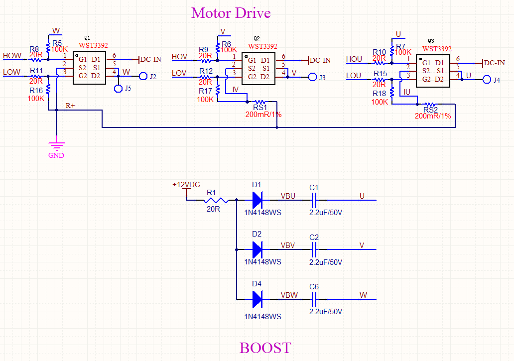 H橋電路采用上下管均為NMOS的配置,總計(jì)6個NMOS組成三相H半橋驅(qū)動電路。