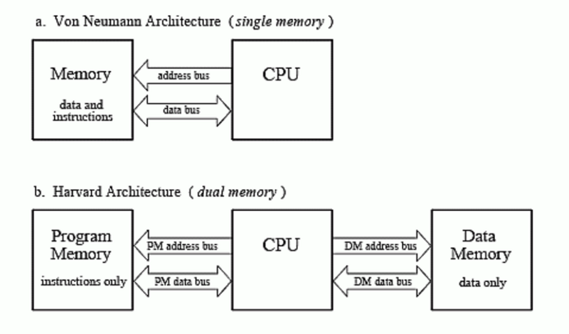 當前,雖然最近幾年有一個叫做存內計算的架構非常火熱,但我們比較熟悉的處理器架構基本都是馮諾依曼架構(von Neumann architecture)和哈佛架構(Harvard architecture)。其中,馮·諾依曼結構的處理器使用同一個存儲器,經(jīng)由同一個總線傳輸;哈佛結構是一種將程序指令存儲和數(shù)據(jù)存儲分開的存儲器結構。